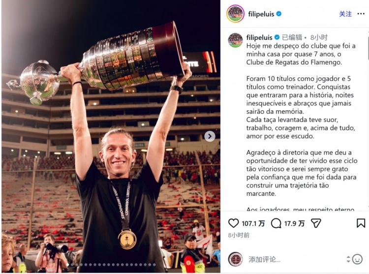 3月4日讯 弗拉门戈官方宣布主帅费利佩·路易斯离任,费利佩·路易斯社媒发文,与俱乐部告别。